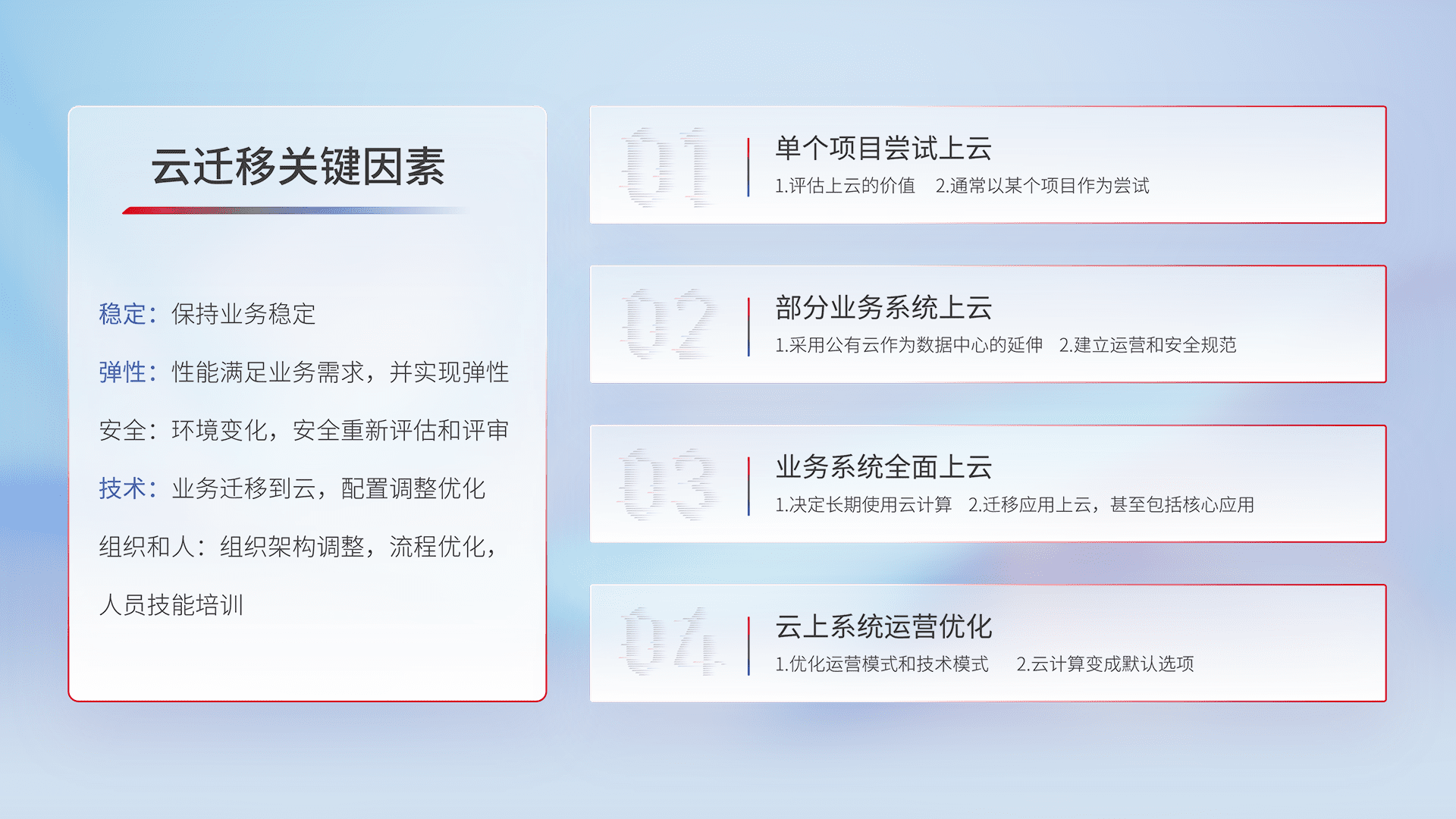 结合实际业务,,,从规划设计、、、云平台选型、、、云原生改造、、数据迁移、、、、集成交付,,,迁移全过程为客户识别最佳上云路径,,,做好风险识别管理,,,设计网络架构、、身份权限、、安全审计合规、、、操作审计、、、、日志审计、、、监控告警策略、、、、多站点容灾设计等,,对云上基础设施进行整体规划,,,,提升IT治理水平,,,以满足弹性、、高可用、、、高性能的需求。。。