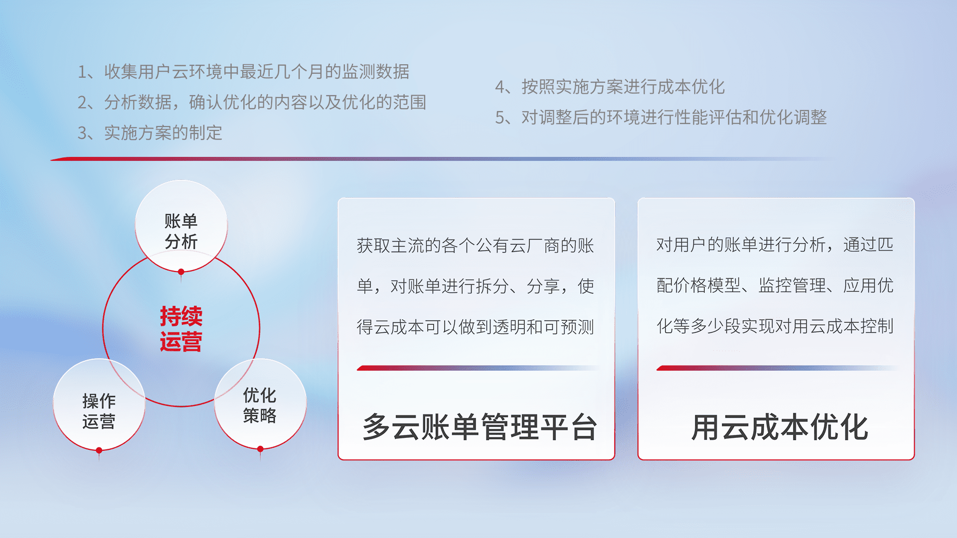 通过多云纳管,,,,以统一的资源数据模型把客户的云资源进行抽象和封装,,进而实现对多云资源的统一操作,,,,保障云资源管理的可靠性、、、、稳定性与可用性。。量身定制化运维内容,,,配置、、、、开发运维、、补丁管理、、、备份、、监控、、、认证和访问管理、、、、审计和日常巡检等,,,保障在用云过程中的可靠度,,,稳定度以及高可用率。。